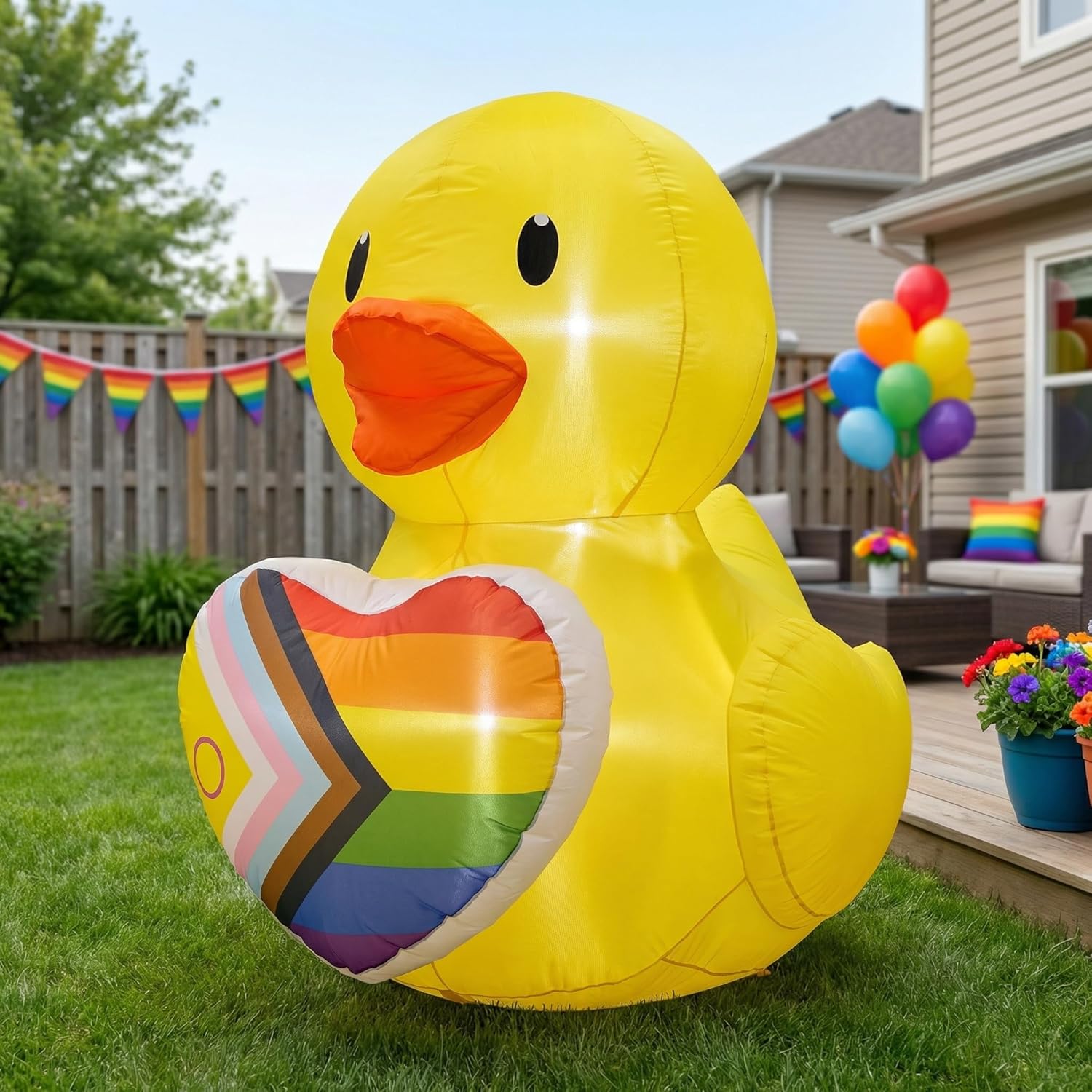 • Rainbow Duck Design for Pride Displays: This inflatable duck with a rainbow heart creates a cheerful focal point for celebrations and support displays. Measuring approx. 3.1FT L × 3.9FT W × 4.0FT H, it fits well in yards, patios, porches, and event spaces. It works naturally as pride decorations, pride decorations outdoor, pride decor, gay pride decorations, rainbow decorations, and pride month decorations.