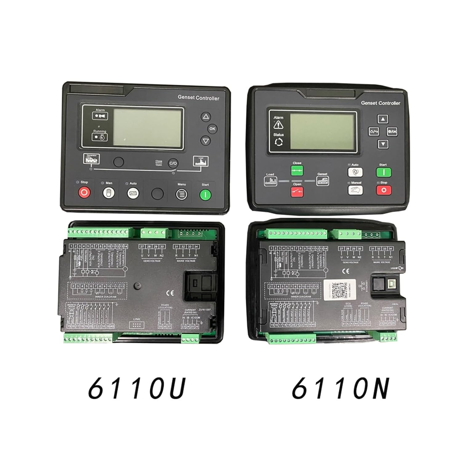 Electronic Engine ControlController HGM6110U HGN6110N Product DescriptionHGM6100N series automatic controller, integrating digital, intelligent and network techniques, is used for automatic control and monitoring system of genset. It can carry out functions of automatic start/stop, data measurement, alarm protection and three "remote" (remote control, remote measure and remote communication). The controller uses display, optional display interface including Chinese, English, Spanish, Russian, Portuguese, Turkey, Polish and French with easy and reliable operation.HGM6100N series automatic controller uses micro-processing technique which can achieve precision measurement, value adjustment, and threshold setting etc.. All the parameters can be configured from front panel or use USB interface (or RS485 interface) to adjust via PC. It can be widely used in all types of automatic control system for its compact structure, simple connections and high reliability.PERFORMANCE AND CHARACTERISTICSHGM6100N controller has six variants:HGM6110N/6110NC/6110CAN: Automatic Start Module, it controls generator to start/stop by remote start signal;HGM6120N/6120NC/6120CAN: Based on HGM6110N/6110NC/6110CAN, it adds mains AC monitoring and mains/generator automatic switching control (AMF), especially suitable for the automation system composed by mains and genset.Note1: HGM6110NC/6120NC has RS485 port, HGM6110N/6120N without. HGM6110CAN/6120CAN has CAN port, HGM6110N/6120N and HGM6110NC/6120NC without.Note2: HGM6110/6120 is taken as an example to describe in this manual.1. 132*64 display with backlight, optional language interface (Chinese, English, Spanish, Russian, Portuguese, Turkey, Polish and French), push-button operation;2. Acrylic screen, improved wearable and scratch resistance property;3. Silica-gel panel and keys can well adapt to higher and lower temperature;4. With RS485 communication port, can achieve "three remote" functions via MODBUS protocol;5. With CANBUS port which can be connected to electronic injection with J1939, it not only can monitor frequently-used data (such as water temperature, oil pressure, rotated speed and fuel consumption, etc.) but also can control start, stop, high speed and low speed (controller with CANBUS port is needed) via CANBUS port.6. Adapt to 3P4W, 3P3W, 1P2W and 2P3W (120V/240V), 50Hz/60Hz AC power system;7. Can measure and display 3 phase voltage, 3 phase current, frequency, power parameter of mains/gens;8. Mains have functions of over/under voltage and lack of phase; Gens have functions of over/under voltage, over/under frequency, over current and over power;9. Precision measure and display of parameters about engine,10. Control protection: Automatic start/stop of genset, load transfer(ATS control) and perfect failure display and protection;11. With ETS, idle speed control, pre-heat control, speed droop/raising control, all of them are relay output;12. Parameter setting: Allow user to modify setting and store them in internal FLASH memory. The parameters cannot be lost even when power off. All of parameters can be set not only from the front panel, but also use USB interface (or PS485 interface) to adjust them via PC.;13. Multi sensors of temperature, pressure and fuel level can be used directly, parameters can be defined by user;14. Multi conditions of crank disconnect (speed sensor, oil pressure, generator) can be selected;15. With emergency start function;16. With flywheel teeth numbers automatic identification function;17. Power supply range: (8~35)VDC, accommodating to different starting battery volts;18. All parameters use digital modulation, instead of analog modulation using conventional potentiometer, having improved reliability and stability;19. With maintenance function. Types (date or running time) can be selected and actions (warning or alarm shutdown) can be set when maintenance time out;20. Event log, real-time clock, scheduled start & stop pump unit can be set as start pump unit once a dayweekmonth whether with load or not;21. Add rubber gasket between shell and controller screen, the waterproof can IP55;22. Controller is fixed by metal fixing clips;23. Modular design, flame-retardant ABS shell, embedded mounting, compact structure and easy installation.
